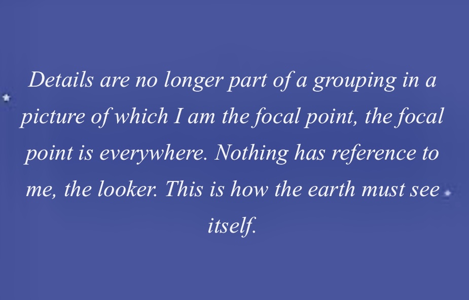 Her sentences are as clear and bracing as a mountain stream. At one moment, she lists alpine flowers with the precision of a botanist – “birdsfoot trefoil, tormentil, blaeberry” – and at the next, she dissolves perspective itself: “The focal point is everywhere. Nothing has reference to me, the looker. This is how the Earth must see itself.”